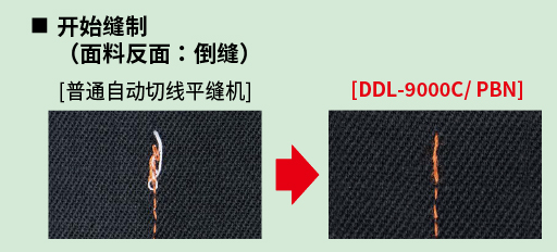 采用全新切线法,新型切线机构直接在针板下方进行切线,缝制结束时的最后一针(或两针)则以短缝线进行缩缝。