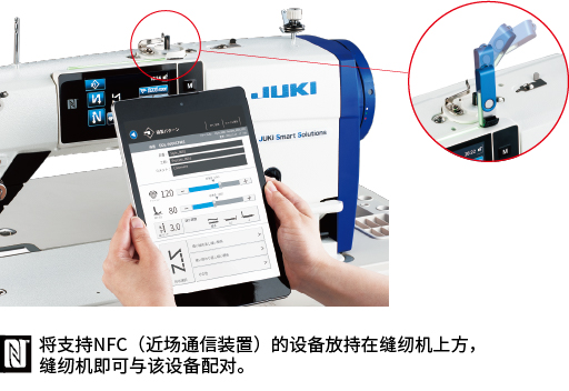 根据缝制产品调整缝纫机数据,以无接触方式将数据传输到市场上销售的安卓系统平板电脑。这样便可以快速检查统一设定,确认缝制流水线的缝纫机状况,更改设定更方便。