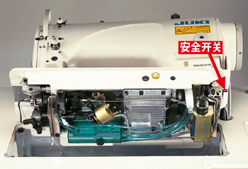 即使在电源打开的情况下倾斜机头,安全开关也会关闭机器。机头倾斜时,即使踩下脚踏板,机器也不会运转。