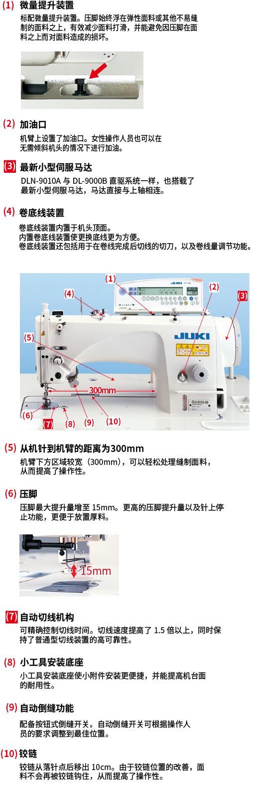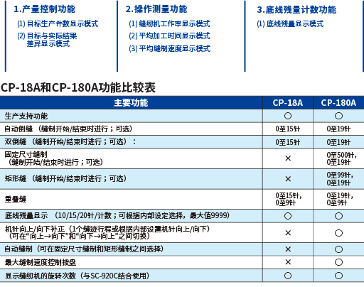 | 压脚提升量 | 手动:5.5mm,膝动:15mm(最大),自动:10mm | |