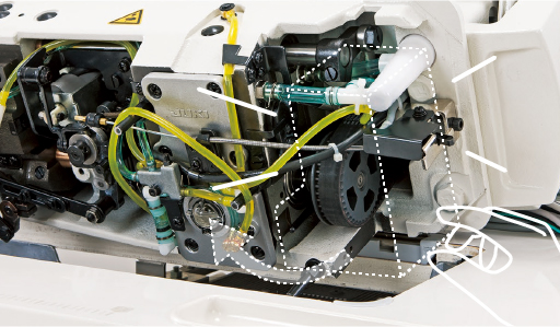 在重新调查了供油方式后,将油箱位置设在缝纫机内部。因此,机台下方有足够空间,便于送布方式(“针送布”和“下送布”)的切换,以及送布时相的切换(同步皮带重新放置)。