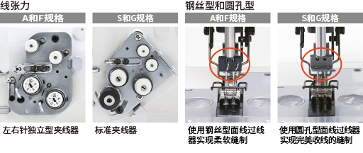 根据不同的机型,开发了钢丝型和圆孔型两种面线过线器(夹线器)。采用钢丝型的A和F规格,对应薄料和内衣缝制,不产生皱褶,缝迹均匀。采用圆孔型的S和G规格,对应需要完美收线的面料。此外,G规格标配了引导压脚,使压线工序更有效。