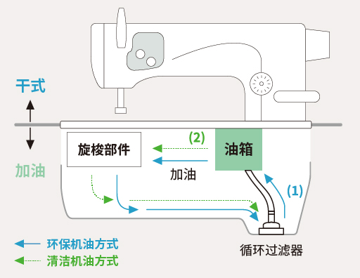 环保机油方式(循环式)从旋梭周边滴落到底盘中的机油,过滤掉灰尘和污垢后,返回油箱。这样可以省却供油作业,降低油耗。