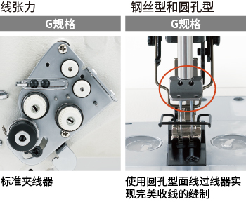 根据不同的机型,开发了钢丝型和圆孔型两种面线过线器(夹线器)。采用圆孔型的G规格,对应需要完美收线的面料。此外,G规格标配引导压脚,使压线工序更有效。