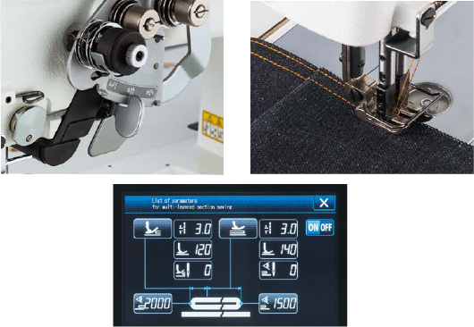 因此,线更换频率减少了一半。这款配置大旋梭的世界首创缝纫机,不仅适合缝制牛仔布和厚料,也适合缝制内衣和中厚料。缝制质量更稳定。 - 采用了马达控制水平送布方式。可以在操作面板上设定针距。
