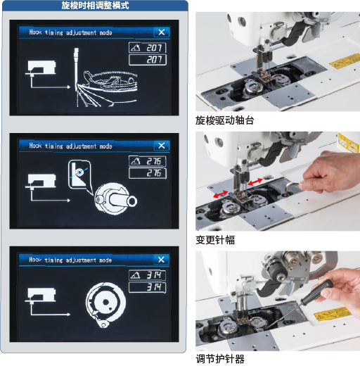 变更针幅时需要调整旋梭同步。调整时间缩短。采用通过操作面板启用的旋梭同步调整模式,以及新型旋梭驱动轴台,可显著减少变更针幅时所需的工作量。通过螺钉可轻松调节旋梭护针器。