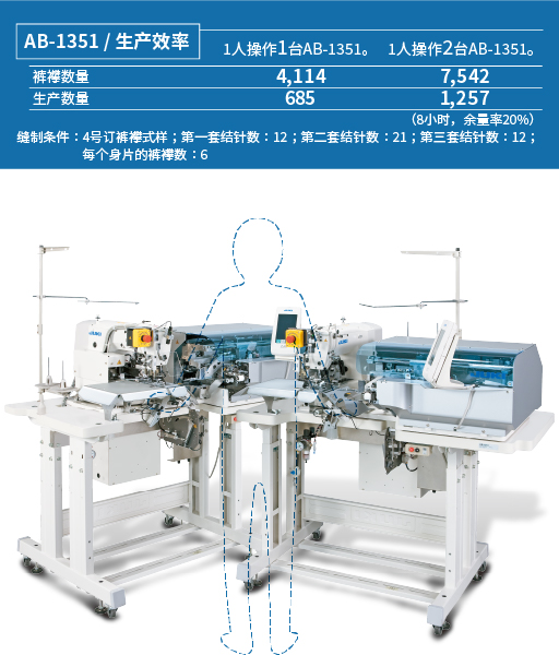 1人同时操作2台AB-1351。如图所示放置2台AB-1351,操作人员可以在2台机器上交替进行订裤襻作业,大幅提高了生产效率。