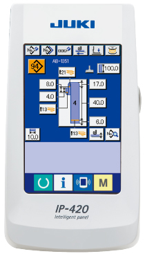 AB-1351的操作面板采用大尺寸彩色液晶触摸面板IP-420。通过操作面板,操作人员可以更改裤襻形状或缝制式样,设定订裤襻位置,以及进行循环缝制。裤襻宽幅变化时,可以根据裤襻宽幅变化的百分比自动变更套结宽幅。数字化控制大幅缩短了缝制数据的调整时间。