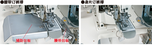 通过安装/拆卸辅助台板(辅助台板和腰带台板),可应对腰带订裤襻(平面缝制)和身片订裤襻(筒形缝制)两种缝制式样。启动开关的位置也可以更改。(辅助台板作为标准附件配备。)