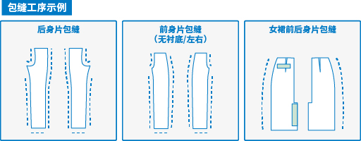 适用于裁剪成各种形状的牛仔裤、裤子和裙子缝制品的包缝工序。