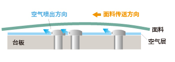 配备喷气台板,从三个位置的空气喷嘴喷出空气,使面料的移动更顺畅。