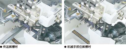 机器预先检测裤襻中的每个接缝并进行高效处理。即使机器在进行接缝处理流程,裤襻送布装置仍可以完成裤襻传送动作,并在机器起缝之前传送好下一个裤襻。因此,操作人员可以有节奏且高效地进行缝制作业,而不会造成循环时间的延迟。通过检测面料厚度的变化,机器的电位器会发现裤襻中的接缝并进行完美处理。