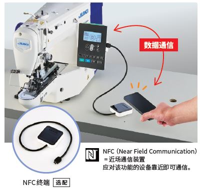 标准液晶操作面板标配USB接口、缝纫机间的数据管理或软件升级变的方便。而且使用选配的NFC端口、可通过市面上销售的Android设备实现非接触式双向数据通信。