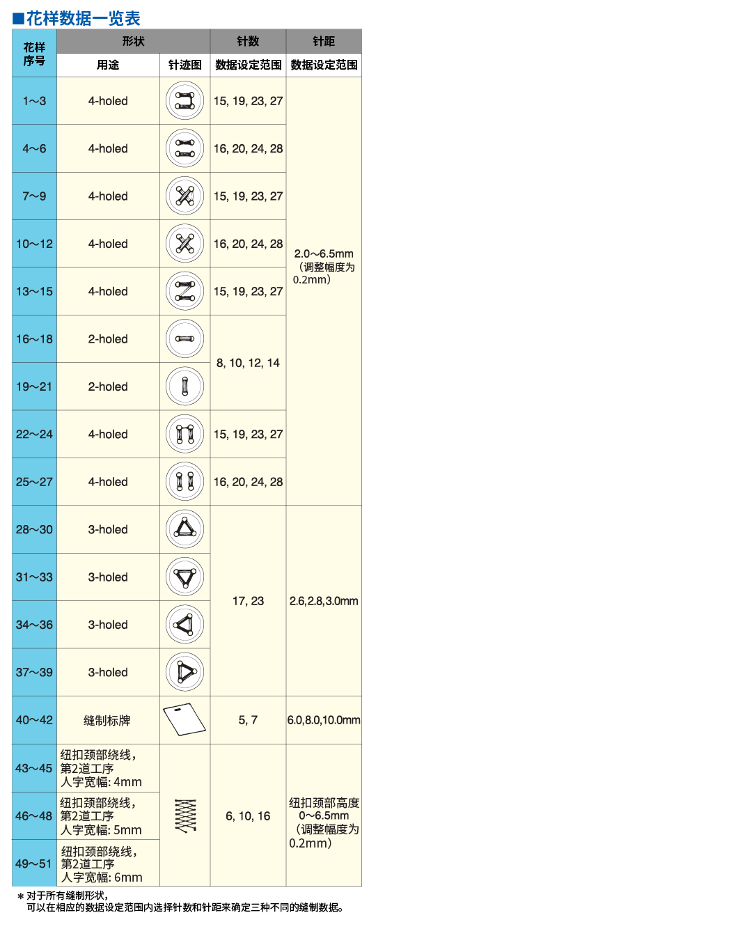 - 标配了55种不同的缝制花样。可在操作面板上设定缝制花样,更改扣孔间隔和针数。完全能应对各种纽扣规格,适用范围广,节省了规格变更带来的成本,使操作人员不再需要根据规格进行调节。
