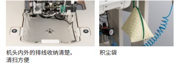 新型马达控制,待机中的电力消耗降低(之前机种 55%)。减低机头发热情况。风力强劲的穿线轨道,空气压力变动不会受影响的切布,在各 种复杂的使用环境中,实现安定的缝制品质。