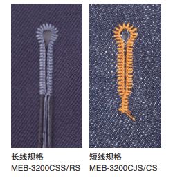 男装 · 女装式样的MEB-3200CSS/RS,面线,弯针线,芯线的残余量留长切线。由于线端切线易于保持的长度,因此很容易进行下一步的固定步骤。 牛仔裤规格 MEB-3200CJS、棉工作裤规格 MEB-3200CCS 可缩短面线、弯针线和芯线 的残余量。无需摘线头工作,因此提高了工作效率,提高了生产性。