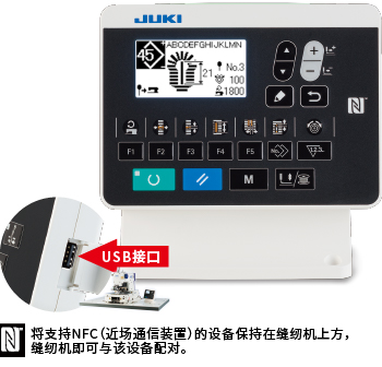 根据缝制产品调整缝纫机数据,以无接触方式将数据传输到市场上销售的安卓系统平板电脑。这样便可以快速检查统一设定,确认缝制流水线的缝纫机状况,更改设定更方便。操作面板还标配了USB接口。可通过U盘轻松进行数据管理和软件更新。