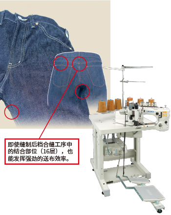即使缝制后档合缝工序中的结合部位(16层),也能发挥强劲的送布效率。