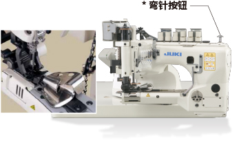 按下位于机头上部靠操作人员一侧的弯针按钮(*)时,弯针前端向下移动,使操作人员可以轻松进行穿线。