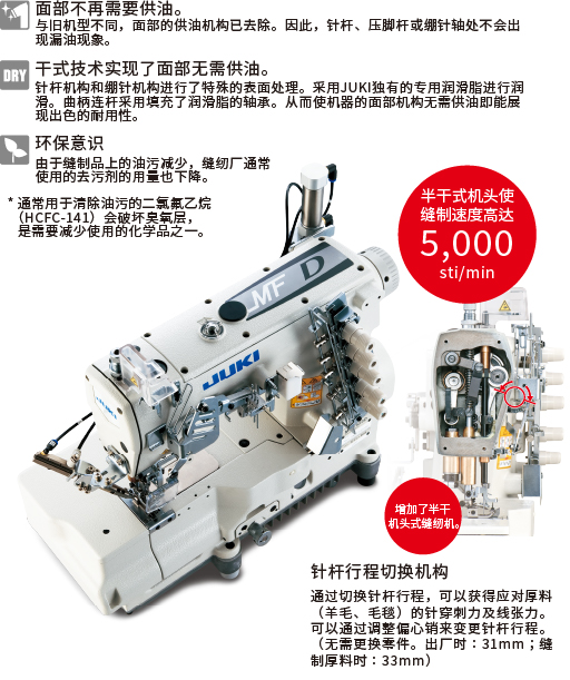 MF-7500D传承了MF-7500系列的出色功能,并配备了干式面部机构,去除了油污问题。由于缝制品不再受油污影响,去油污或重缝作业大幅减少,从而提高成品的质量。