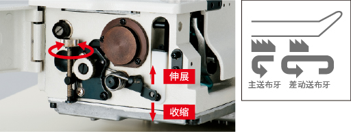可以调整送布的纵向位置。因此,减少了缝制内衣等弹性面料时经常出现的送布不均匀和起皱现象。从而提高了对弹性面料的应对能力。