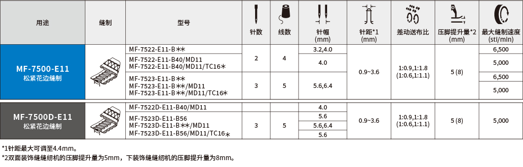 | 压脚提升量 | 5mm(双面装饰缝),8mm(下装饰缝) | |||