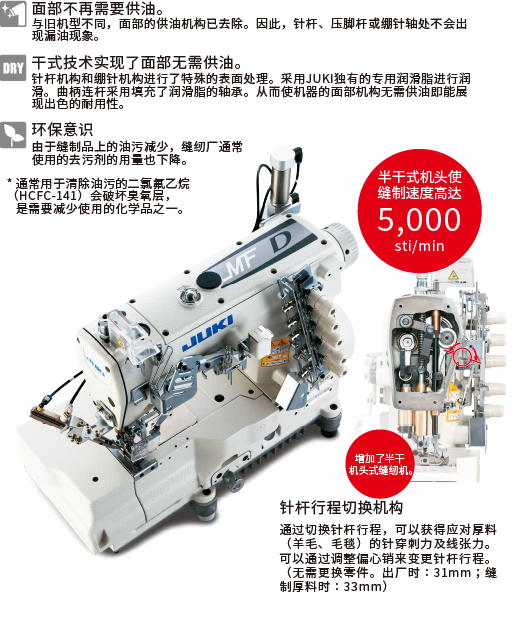 MF-7500D传承了MF-7500系列的出色功能,并配备了干式面部机构,去除了油污问题。由于缝制品不再受油污影响,去油污或重缝作业大幅减少,从而提高成品的质量。