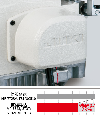 所有带切线装置的缝纫机均采用直驱马达系统。因此缝纫机能迅速启动,提高停止精度,从而保证良好的反应能力。此外,不再配备V形皮带。采用直驱马达能有效避免皮带上落下的皮屑。马达直接向缝纫机传输动力,降低了耗电量。(与旧机型相比,耗电量降低了29%。)