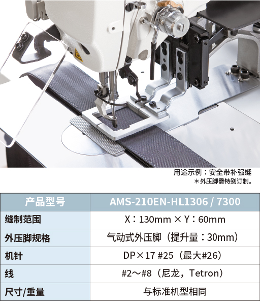 AMS-210EN-HL1306/7300采用滑动式挑线杆式杆,提高了粗线的收线程度。JUKI独特的电子夹线机构经重新设计,专用于缝制厚料,而适合缝制厚料的滑动式挑线杆,与JUKI AMS系列标准机型相比,最大张力增加了50%多。提高了缝制安全带,及箱包带和包袋等一般厚料的缝制质量(收线张力)。