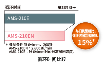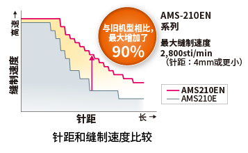 AMS-210EN针距4mm,最大缝制速度为2,800sti/min,为工业缝纫机行业的最高缝制速度和针距。与旧机型相比,即使以大针距,AMS-210EN的缝制速度提高了90%,AMS-221EN的缝制速度提高了60%,大幅缩短了循环时间。