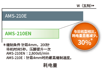 AMS-210EN采用经济高效的低耗节能设计。采用小型交流伺服马达进行上轴直驱,动力传输卓越,并采用编码器控制系统,根据面料厚度和针距长度以最小功率驱动步进马达,控制X-Y轴驱动机构。JUKI新型AMS系列与以往的AMS-210E相比,耗电量降低了30%。