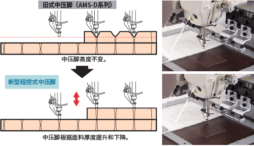 重叠面料的缝制过程中,可更改中压脚的下死点高度(标准:0~3.5mm;最大:0~7.0mm)。中压脚可以确实地压住面料,防止跳针、断线等问题。此外,中压脚能根据面料厚度保持适当高度,防止损伤缝制产品。(中压脚行程可在0和10mm之间调节。)