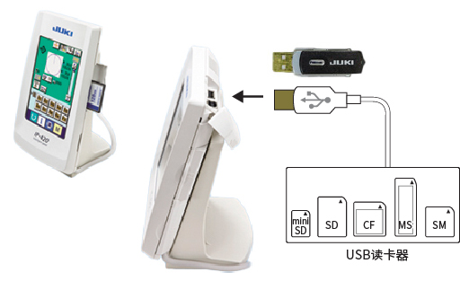 通过USB本体使用各种各样的存储体通过IP-420生成的缝制数据可以存储在缝纫机本体的存储器中。存储容量为50万针和999个花样(一种花样最多5万针)。缝纫机本体还配备了CompactFlash 33卡和USB连接器。可以通过U盘和读卡器从各种记忆媒体(FD(软盘)、SM(SmartMedia)、CF(CompactFlash)、SD(安全数字卡)等)输入/输出数据。每个记忆媒体最多可以存储5,000万针。