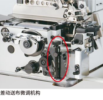 差动送布微调机构,及从外部增加送布差动比和主送布牙高度,均可用螺丝刀在机头面部进行调节。标配根据面料进行便捷调节的功能。
