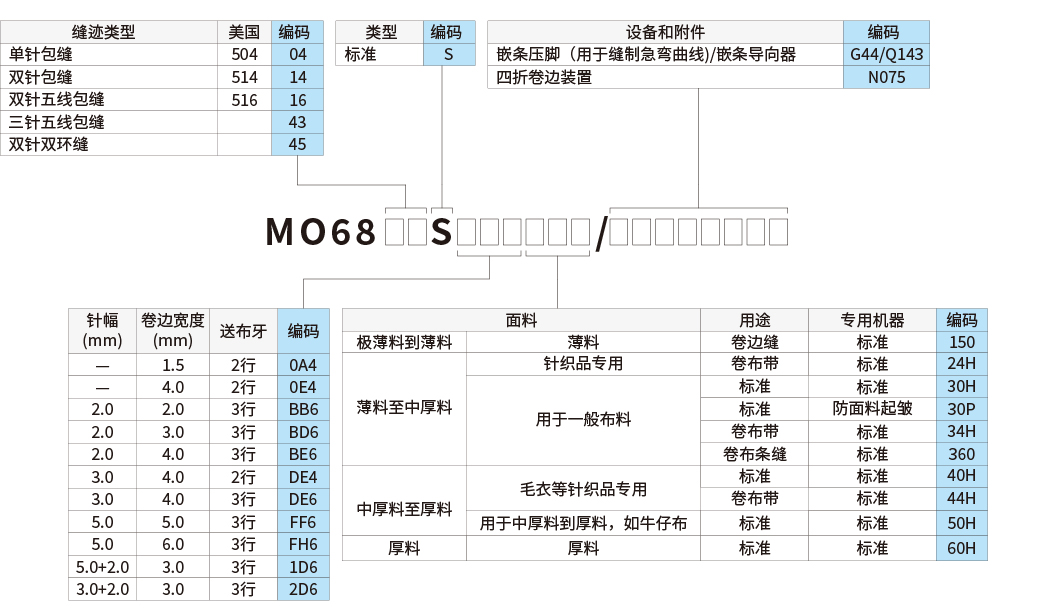 | 缝迹类型 | 单针包缝 | 双针包缝 | 五线包缝 | 三针五线包缝 |