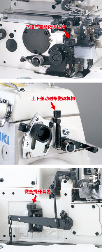 - 上下送布分别配置了差动送布微调机构。标配了下送布牙倾斜度调整机构、扩大差动送布的外部调整机构等各种调整机构,能够根据缝制面料进行相应送布。