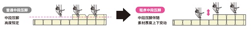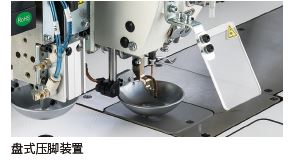 可以在缝纫过程中, 无阶段变更中段压脚下死点高度,因此, 特别是对布层缝纫等有效。中段压脚准确压紧缝纫物, 以此防止跳线和断线等故障的发生。