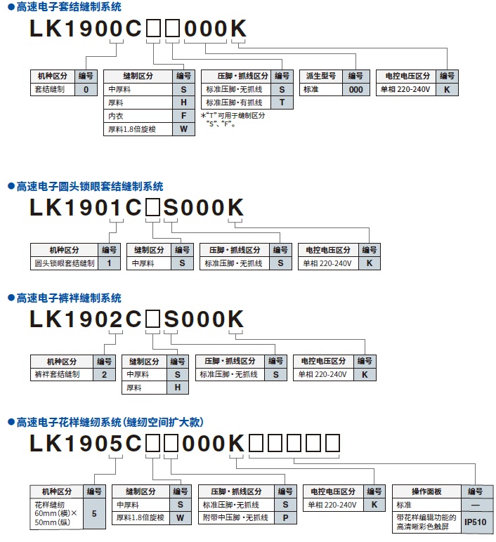 (LK-1900C)●LK-1900C系列,有S型(标准)、H型(厚料)、F型(内衣)、W型(厚料1.8倍釜)、B型(防鸟巢/短线头)5种型号的系列产品,可根据用途进行选择。