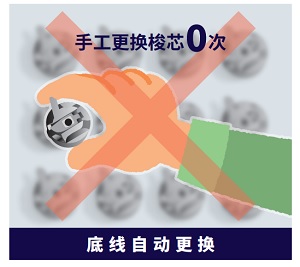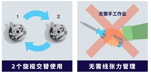 频繁的更换底线、一般需要缝纫工手动更换。 导入 AW-3S 后、在底线用完之前进行自动更换、缝制中装置自 动进行绕线。缝纫工无需注意底线的残存量、集中注意在缝制操 作上。另外,无需担心何时更换梭芯,也无需更换线梭芯本身。 而且、使用 2 个旋梭循环交换操作、无需进行线张力的管理、实 现均一的线张力下保证统一的缝制品质。