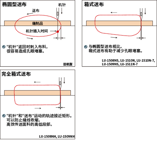 | 送布轨迹 | 箱式送布 | 完全箱式送布 | 箱式送布 | |||