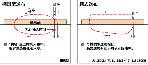 - 采用新型箱式送布机构、交替上下移动机构以及综合送布机构,可以有力平稳地传送厚料。缝迹始终均匀美观,无针距错误。