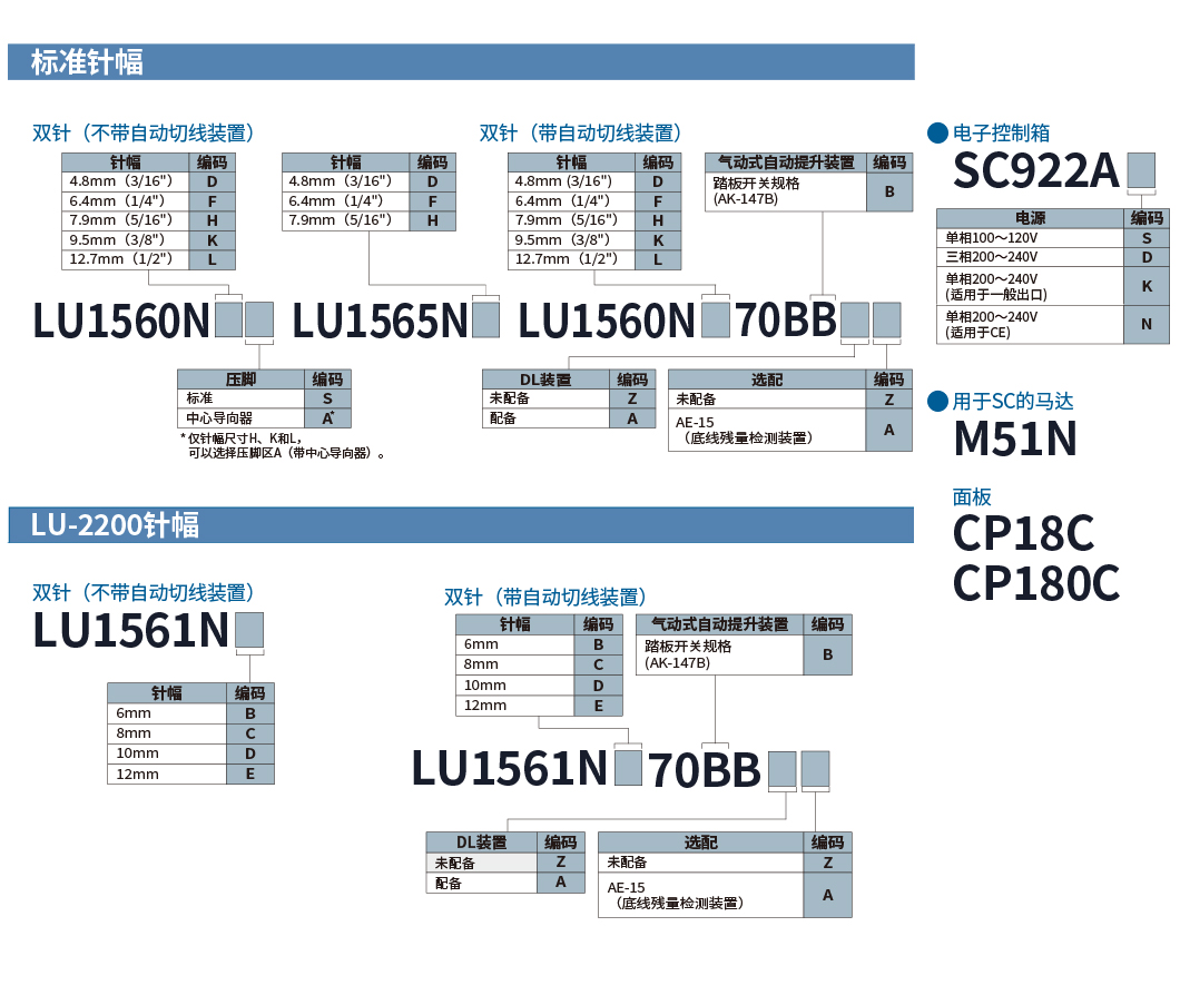 - 具备适合厚料缝制的基本功能和性能的双针标准机型。