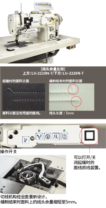 (1.6倍容量旋梭/2针距调节拨盘/短线头规格)减少了起缝和缝制结束时的剪线头工作。提高了汽车座椅缝制的生产效率和缝制质量,性能出色。操作人员使用剪刀的频率降低,能有效防止面料损坏。
