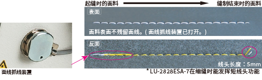 采用全新切线机构。在最后一针(缩缝)处通过线旁的固定切刀切线,线头长度为业界最短。(线头长度为5mm)