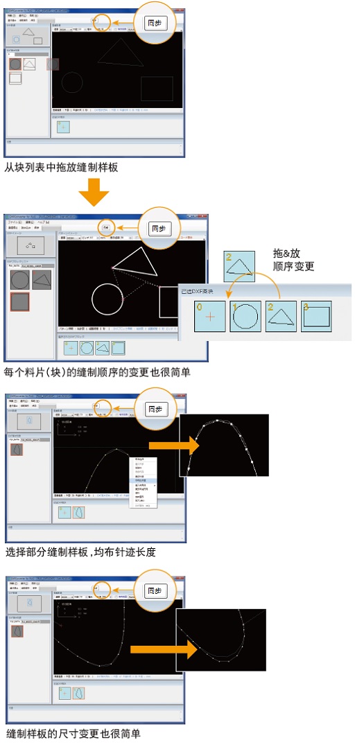 CAD数据变换、修改。把CAD数据转换为缝制数据 → 直观操作,转换简单。