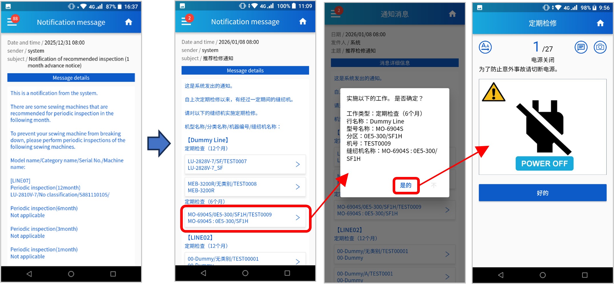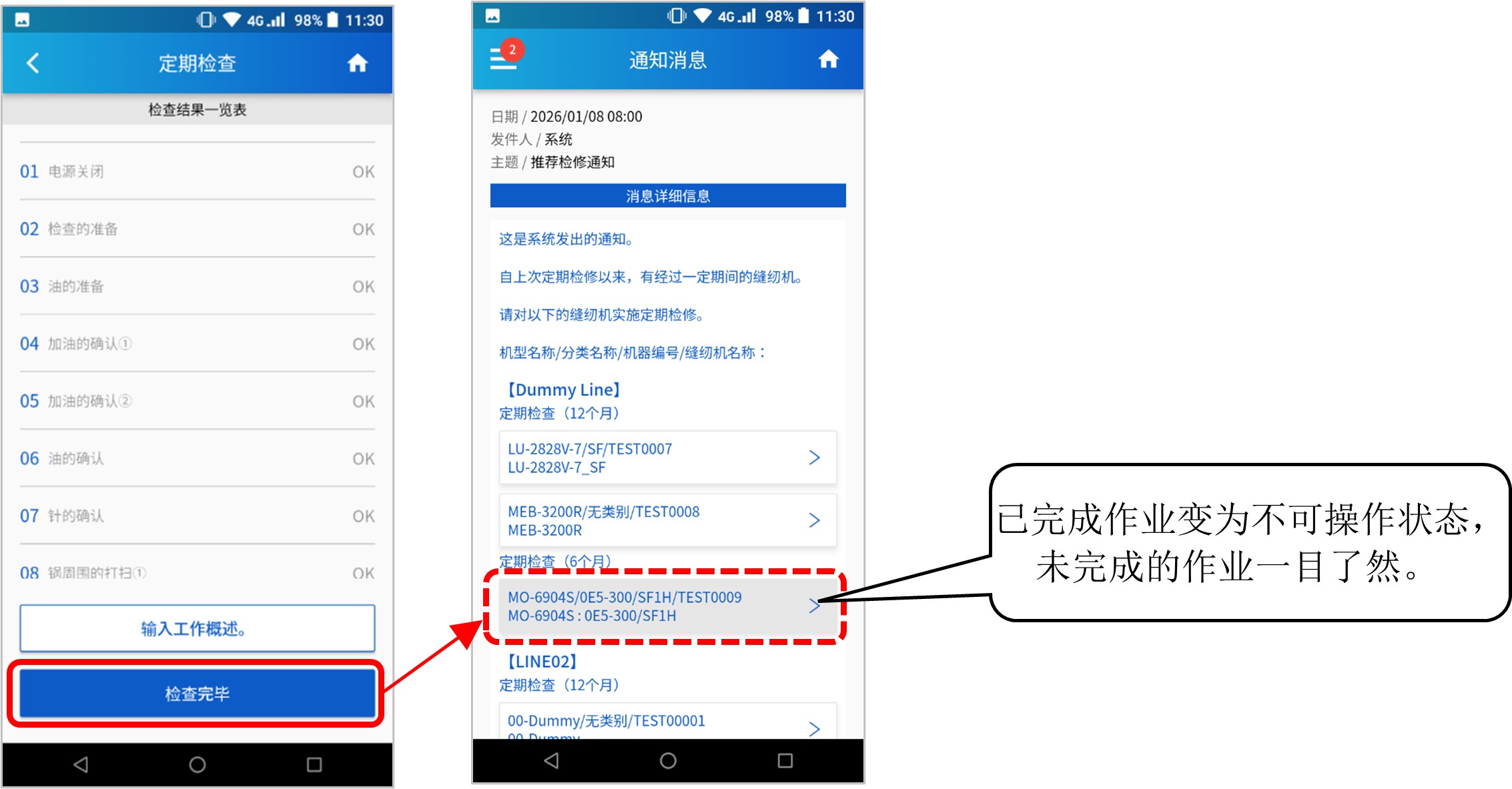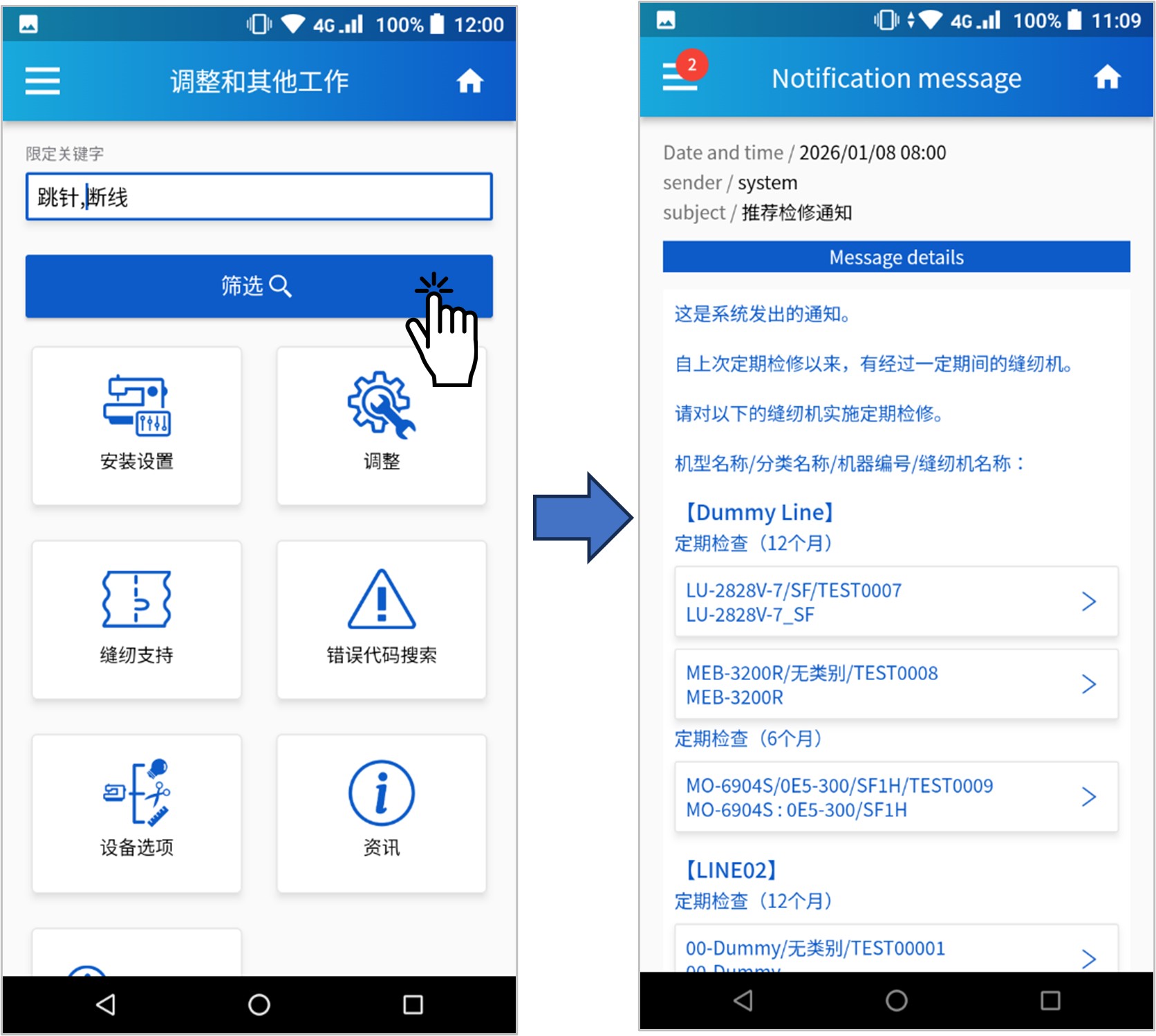 可以直接通过手机应用程序的通知消息,对指定的缝纫机进行检修或零部件更换作业。