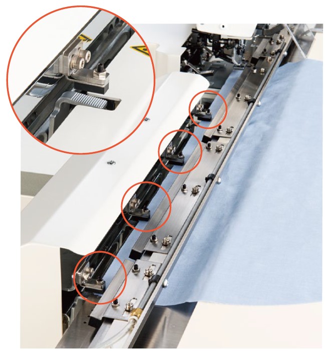 全新配备了一种可以防止在预布料接收时的布料错位(位置偏移)的机构,即使对于垂直条纹的衣料也能实现稳定的缝合质量。