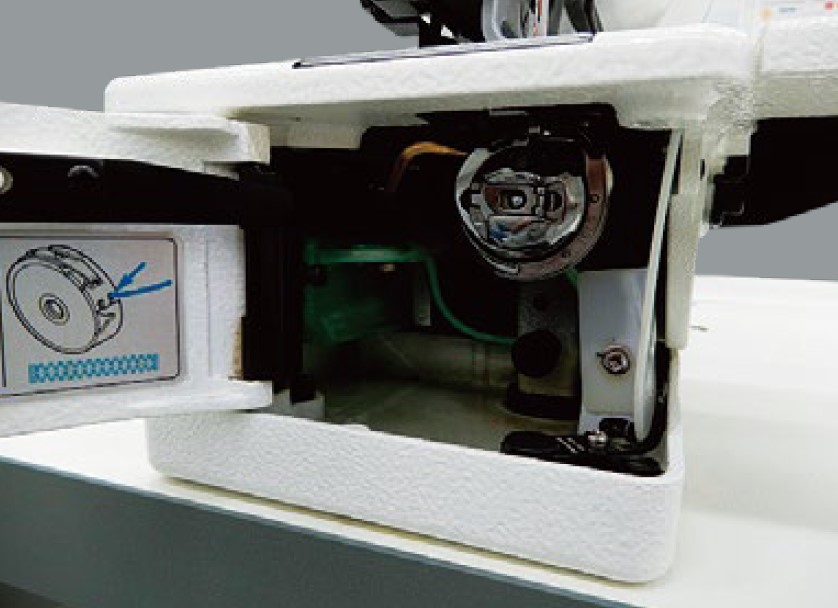 配备最新的LBH-1790AN机头,旋梭盖可以打开,通过新设备置的“旋梭油量调节螺丝”可以轻松调节旋梭油量。